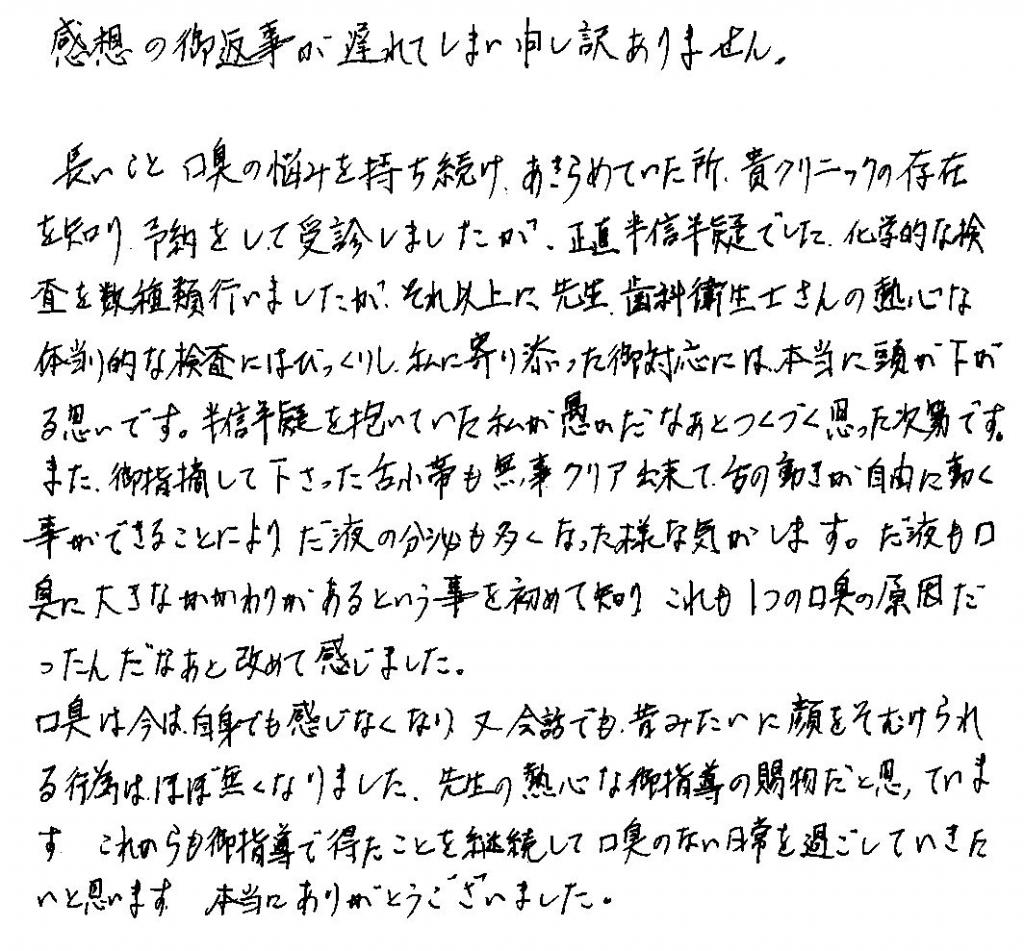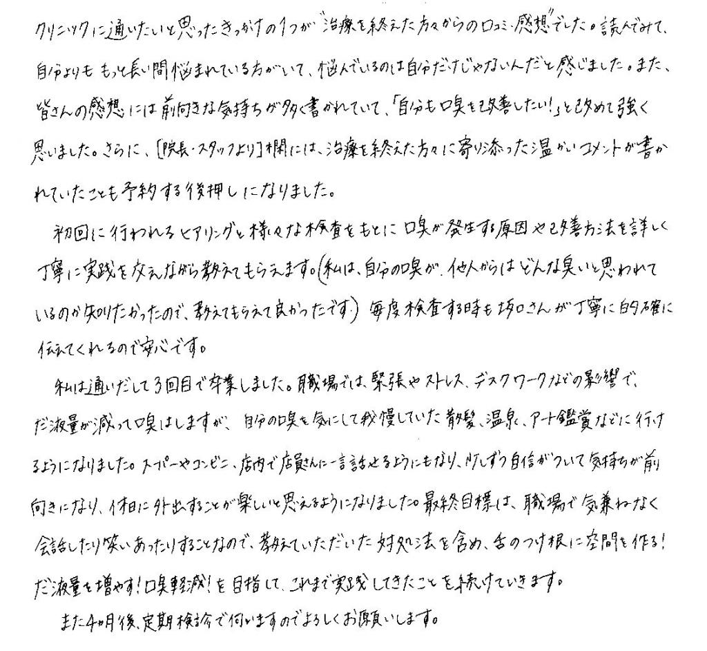 この度は大変お世話になりました。約20年間ずっと口臭に悩んでおり家族に相談しても、気にし過ぎと言われるばかりで自信を失くし人と話すことが怖くなりました。ただ40代になり仕事でも新人教育をする立場になった今、勇気を出し貴院を受診しました。
